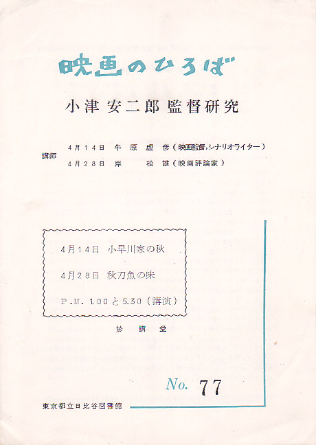 ※「とりわけ、いまだ無名だった頃を「回想」した発言・テキストは、その相当する年代に掲載しました。」とあり、11頁には、(井上和男編『小津安二郎作品集Ⅱ』(立風書房))を参考文献として、「僕は深川生まれで、家の近所に喜八のモデルになるような‥」が掲載されている。同書245頁に掲載されているが、これは初出ではないので、孫引きとなる。孫引きでも頁数を挙示してあると便利だと思われる。また、小津ファンならば、この言葉が、TBSラジオ「この道この人」(1961年3月26日放送)の小津監督の肉声を活字化したものだと分かるだろう。「僕は深川生まれで」の前に、「喜八ものだとか、かあやんだとかの一連の長屋ものですねえ。あれはまあ、」という言葉が入る。これは、LPやCD「小津安二郎の世界」をお聞き頂くか、『キネマ旬報』1999年10月上旬特別号の70頁を読んで頂きたい。
