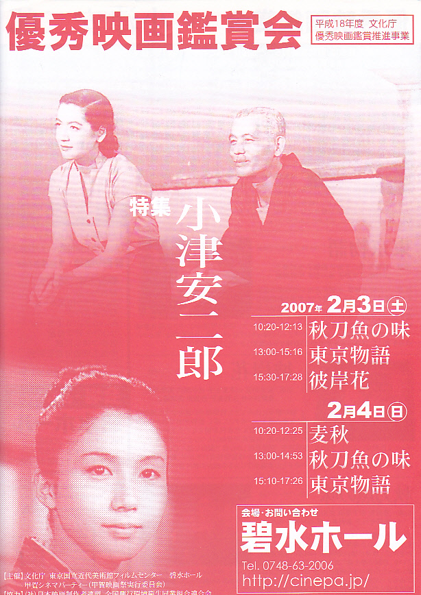平成18年度文化庁優秀映画鑑賞推進事業 特集小津安二郎 2007年2月3日(土)、2月4日(日)、於:碧水ホール(滋賀県甲賀市水口町水口5671)
